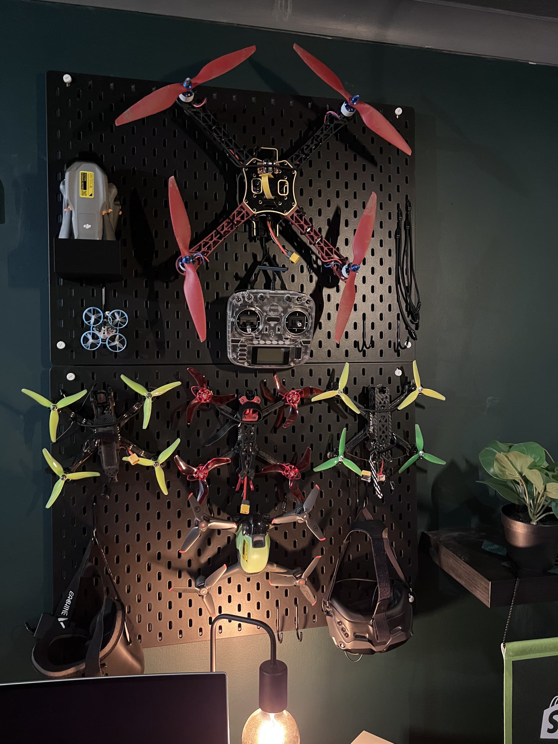 I’ve been adding to the fleet quite a bit recently, and finding safe places for everything to live when not in the air has been… a bit of a challenge. Finally got around to getting a couple of those SKÅDIS pegboard things from Ikea. I have to say I really like them for this use case! They’re easy to put up, flexible, and there’s all kinds of attachments available both from Ikea or for 3D printing at home.