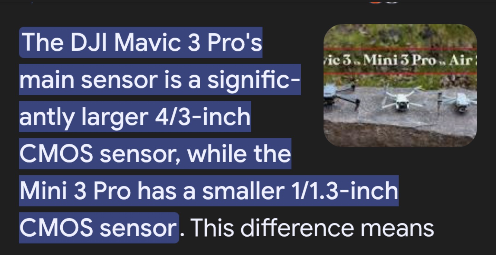 The Mavic 3 is a true 20 megapixel camera with a mechanical shutter and has aperture. The mini 3 pro is only 12 megapixels when shooting in video. If the cameras were the same then I would not have spent all that money on it. I have two Mavic 3. The 3T and the 3M. They both do different jobs. I have the air 2 and the mini 2 as well.
