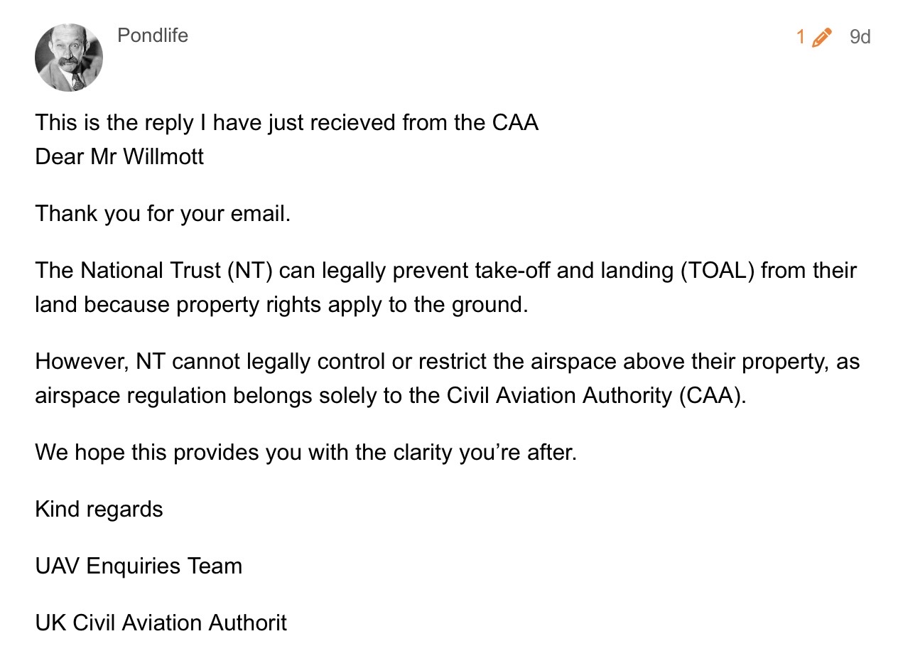 The National Trust (NT) can legally prevent take‑off and landing (TOAL) from their land because property rights apply to the ground.